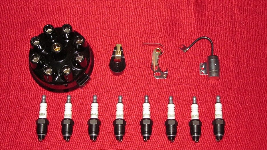 Each kit includes:one distributor cap, one rotor, one ignition points, one condenser and eight AC Delco 10 mm spark plugs.