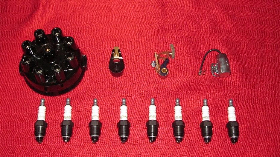 Each kit includes: one distributor cap, one rotor, one ignition points and condenser and one set of AC DELCO spark plugs.